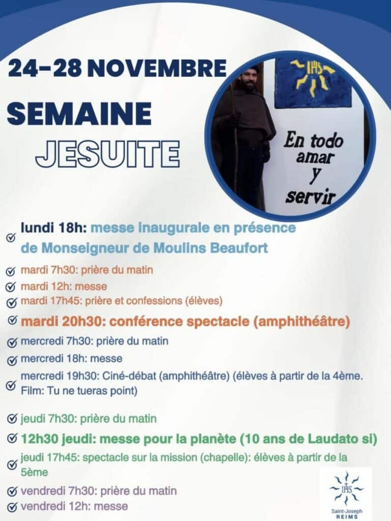 Une très belle Semaine jésuite s’est déroulée à Saint-Joseph de Reims du 24 au 28 novembre 2025 dans un climat de joie et de prière. Les élèves ont découvert la spiritualité et les missions des jésuites à travers des célébrations, des conférences, des spectacles et des temps de prière quotidiens. Une messe inaugurale a été présidée par Mgr Éric de Moulins-Beaufort, suivie de temps forts comme l’adoration, les confessions, la messe Laudato Si’ et un spectacle sur la Mission.
